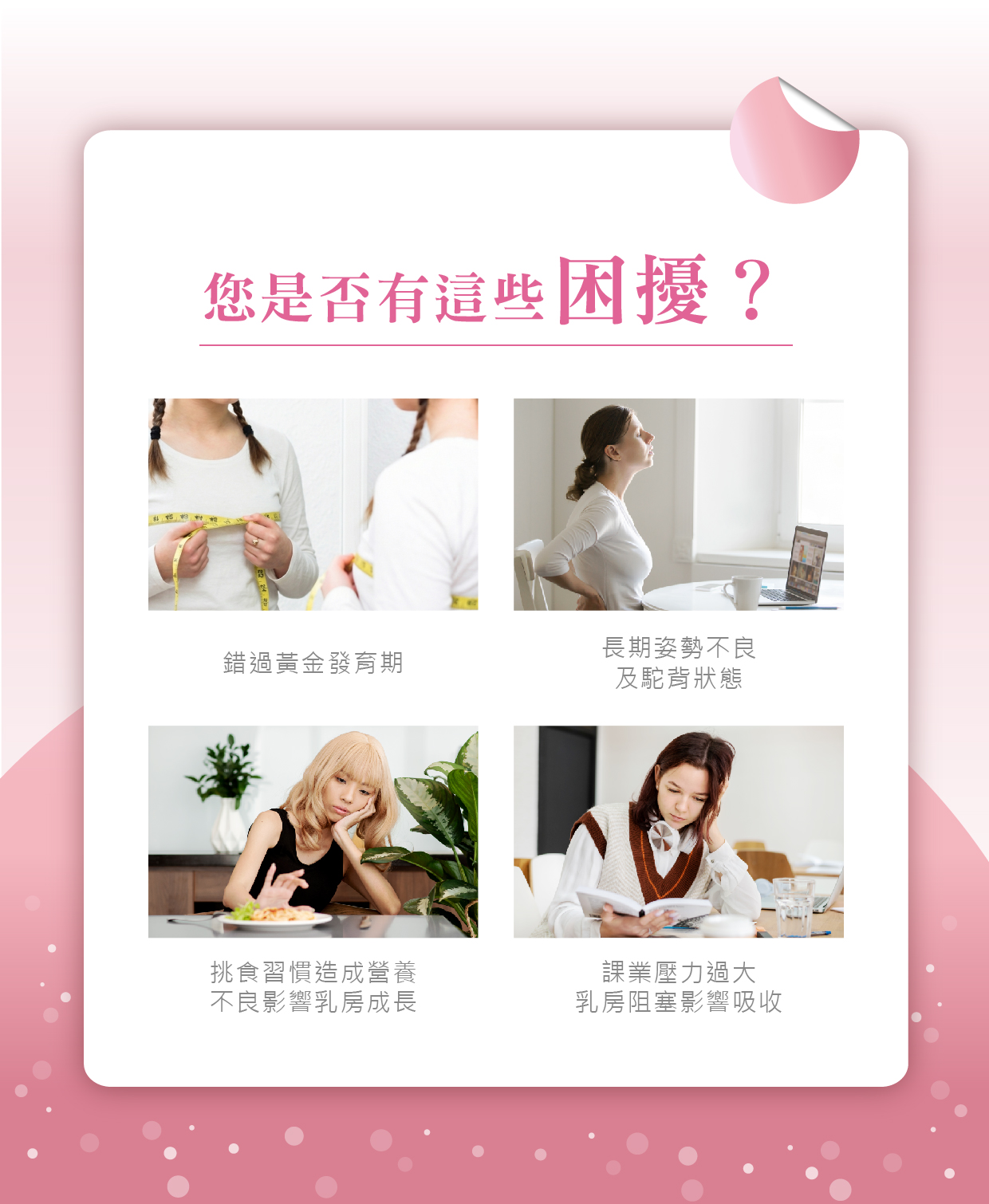 適用對象欲紓緩發育中胸部的不適感/想以活絡按摩放鬆運動量不足的身體/期盼肌膚能獲得充足滋養者