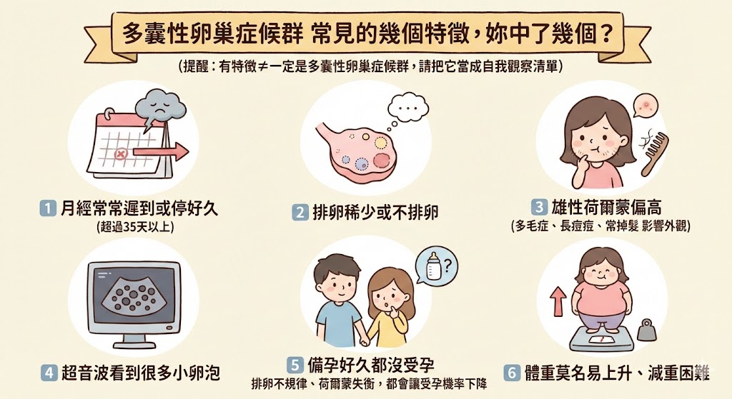 (提醒:有特徵≠一定是多囊性卵巢症候群,請把它當成自我觀察清單)